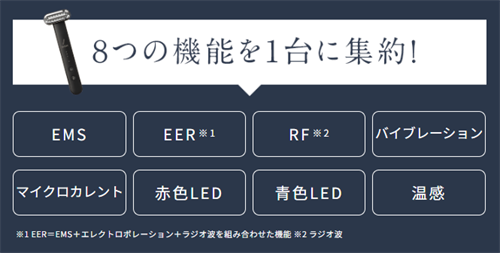 | 主な機能 | EMS、EER、RF、マイクロカレント、LED(赤・青)、温感、バイブレーション |