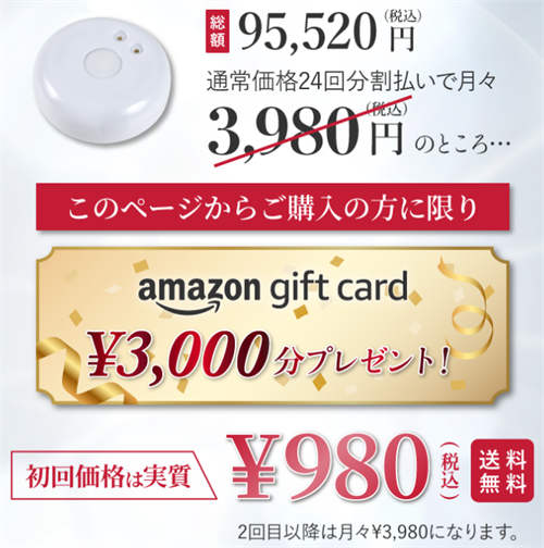 Maskin Care(マスキンケア)は通常価格95,520円(税込)で、24回の分割払いで月々3,980円ですが、キャンペーン中はAmazonギフトカード3,000円分がもらえる上に、初回価格が実質980円という特別価格でスタートできます。