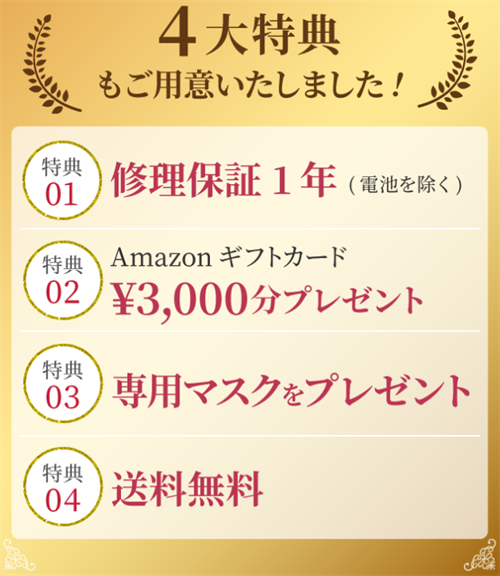 また、1年間の修理保証や専用マスクがプレゼントされるなど、4つの特典も付いています。