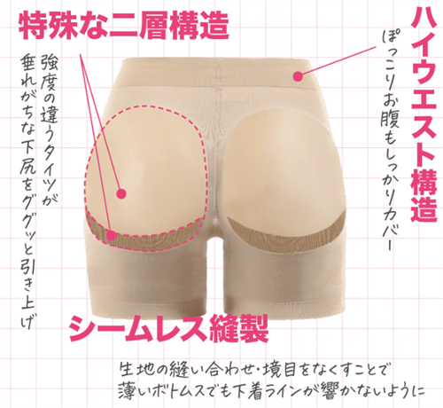 この設計は、お尻を両側から持ち上げ、中心に寄せることで理想的なヒップラインを形成します。