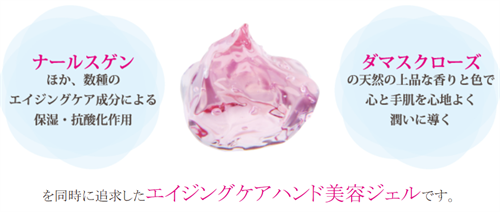 ナールスロゼは、ダマスクローズ水を50%配合し、手肌の保湿とエイジングケアを叶えるハンド美容ジェルです。