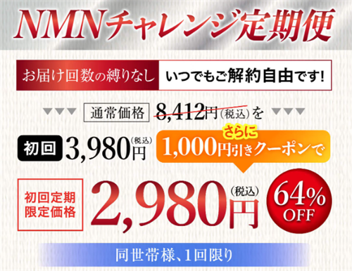 「NMNチャレンジ定期便」は、同一世帯につき1回限りの限定キャンペーンです。