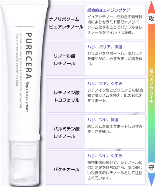 PURECERA(ピュアセラ)リペアアイクリームは、レチノールとナイアシンアミドの相乗効果で、目元にハリとツヤを与え、若々しい印象へと導くアイクリームです。