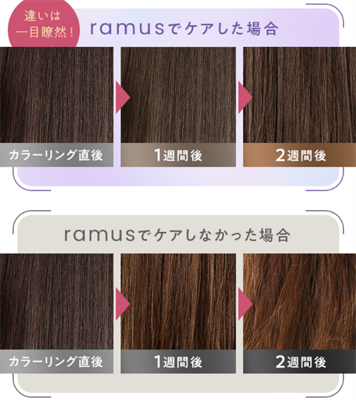 ramusの魅力は、シャンプーとトリートメントをセットで使うことで、補修力・ツヤ・まとまりのバランスが取れた美しい仕上がりになる点にあります。
