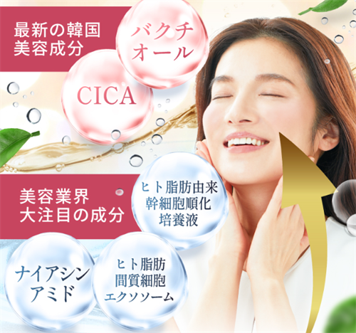 高濃度のバクチオールとCICA、そしてヒト幹細胞順化培養液など、最新の美容成分を贅沢に配合し、肌の奥深くまでしっかりと浸透させることで、シワやシミ、くすみなどを改善します。