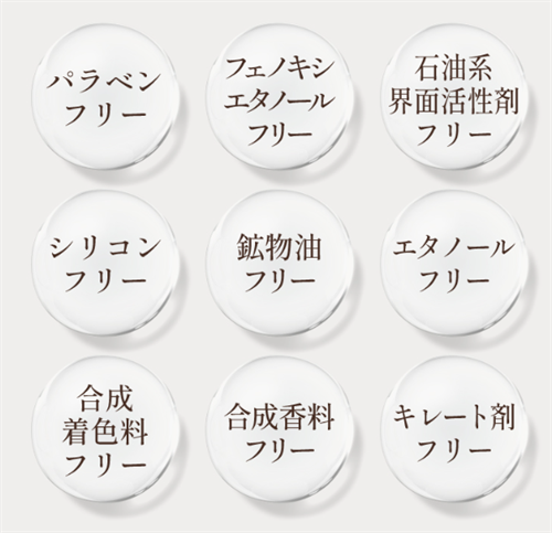 パラベンフリーやフェノキシエタノールフリー、石油系界面活性剤フリーなど、肌に負担をかける可能性のある成分を排除しています。