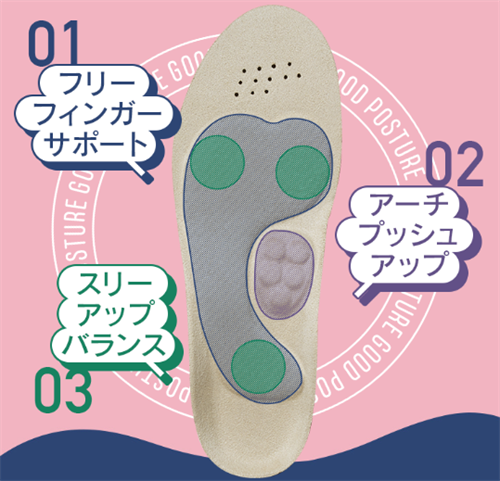 さらに、拇趾球・小趾球・踵の骨の3点をしっかり支え、重心を整えてバランス保持力を向上させます。