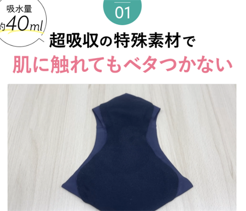 | 吸水力の高さ | 約40mlの吸水力で、生理前や軽い尿漏れ時でも安心して使用できる。 |